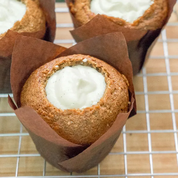 - Выколупываем в кексах дырки с помощью ножа и ложки. Наполняем начинкой, ставим в холодильник минимум на 3-4 часа — нужно, чтобы начинка стабилизировалась и превратилась в настоящий чизкейк.