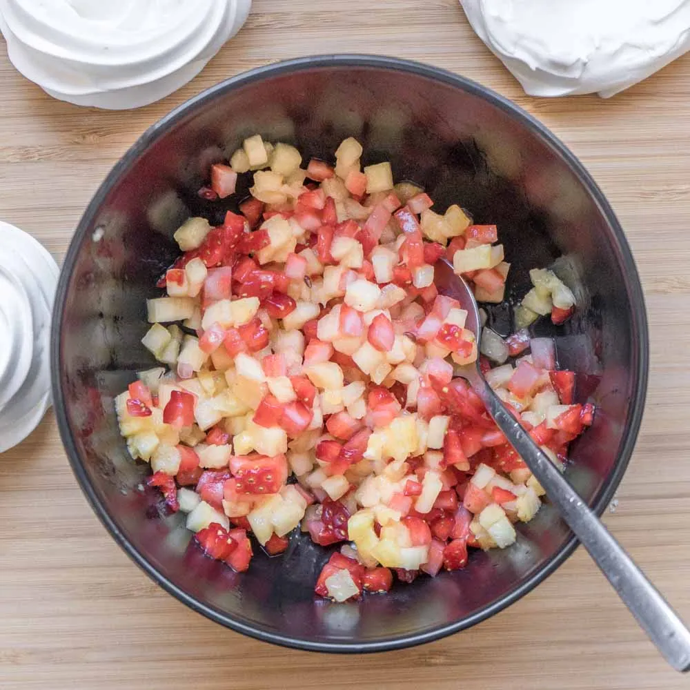 - Для начинки режем мелким кубиком (3-5мм) клубнику и ананас. Можно брать любые другие ягоды/фрукты. Можно стабилизировать начинку желатином, и тогда она не будет размягчать основание так сильно. Я брала свежие фрукты, но через 2-3 часа дно протекло от сока.