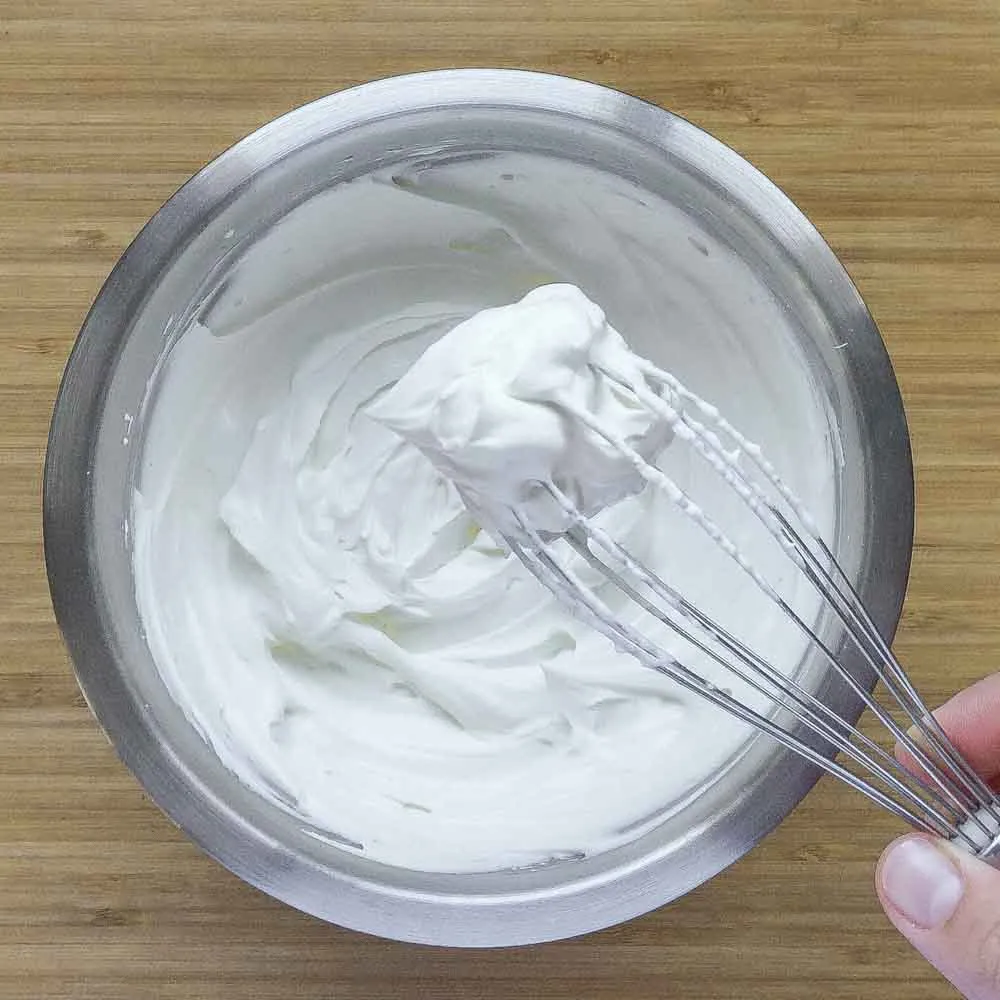- Потом — так же в 3-4 приема вводим сахарную пудру (40 гр.), и взбиваем до уверенного птичьего клюва. У меня на это уходит минут 5-10, зависит от скорости миксера.