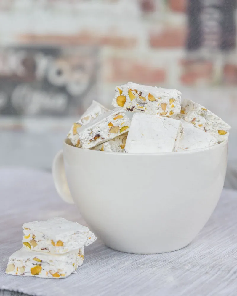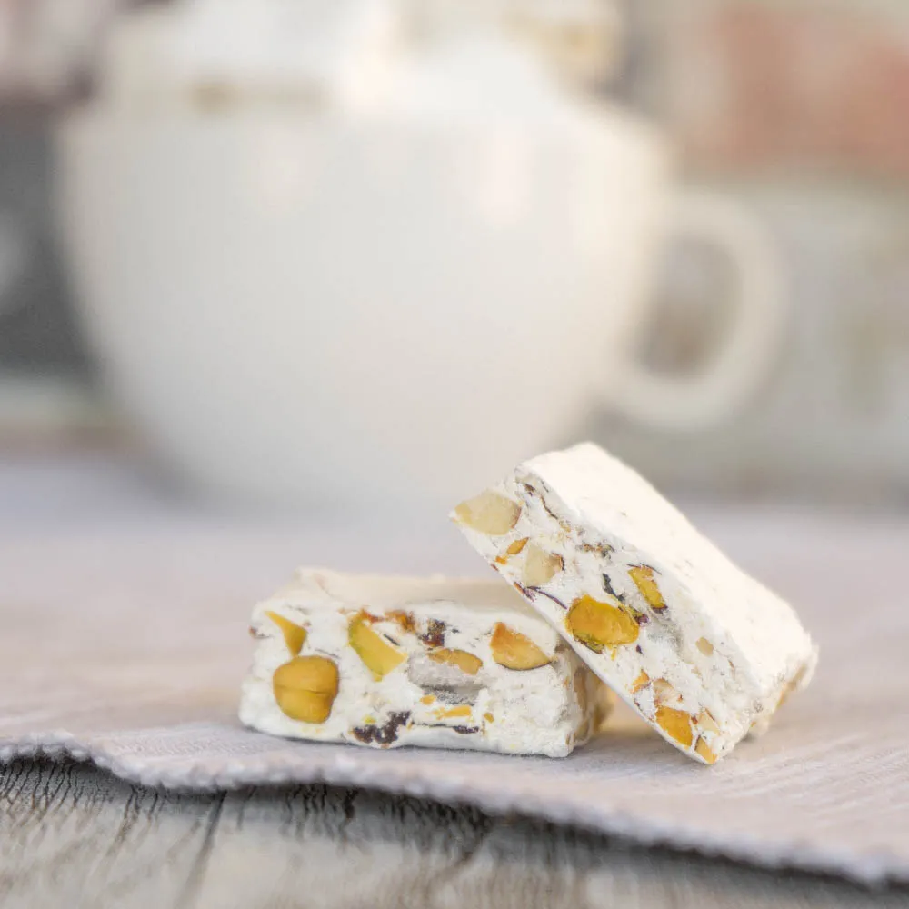 Мне безумно нравится сочетание фисташки и миндаля… или чисто пеканы. С сухофруктами не определилась — курагу я совсем не чувствую, потому что сама нуга сладкая, и курага без кислинки — все сливается в одно (с чем-нить другим не пробовала). А вот орешки — самое то.