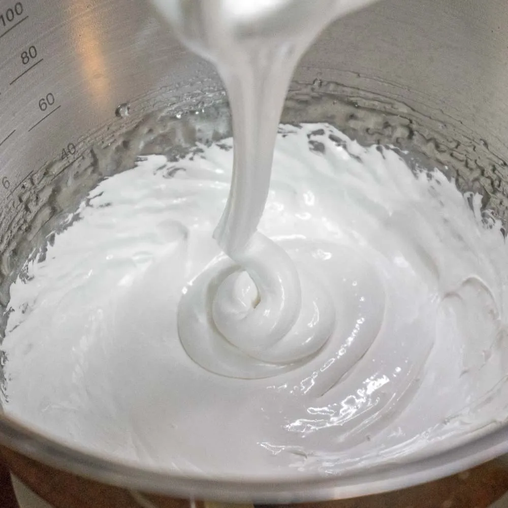 - Как только сироп дошел до нужной температуры, а белок взбился до правильного состояния — увеличиваем скорость миксера до почти максимальной (5-6 из 7), и вводим сироп толстой струйкой в белок, стараясь не попадать на венчик. Не надо делать это очень медленно, чтобы сироп не застыл в полете. Но и не выливай все сразу.