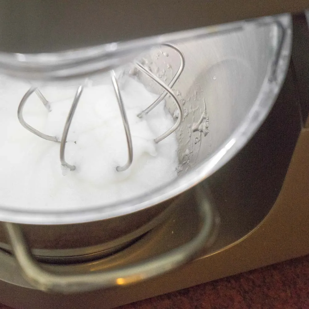 - Пока сироп доходит до нужной температуры, начинаем взбивать белок (40 гр.) с щепоткой соли. Нам нужно довести его до средних пиков. Если миксер стационарный — это будет намного проще.