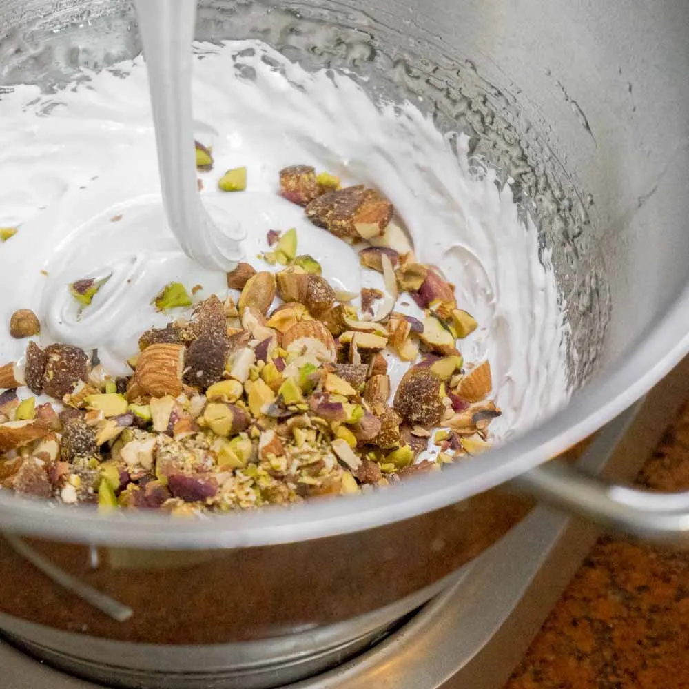 Оговорюсь сразу — нужен мощный миксер — нуга очень тугая, и обычный венчик сгорит. Если твой миксер справляется с зефиром, то и с нугой дожен справиться.
