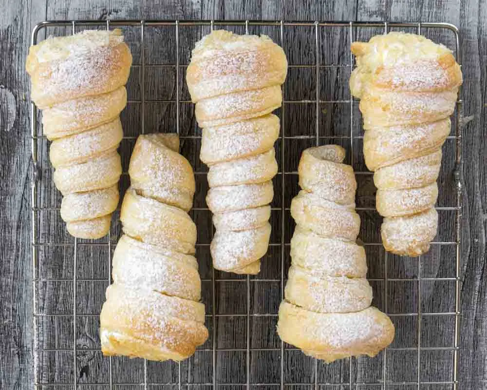 - Выпекаем в хорошо разогретой духовке около 10 минут, до румяности. Охлаждаем на решетке, и только потом, аккуратно проворачивая, снимаем тесто с конусов, чтобы не повредить форму.
