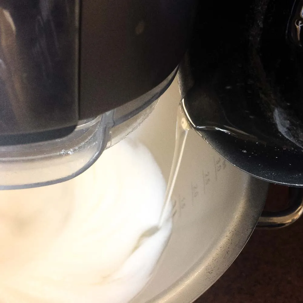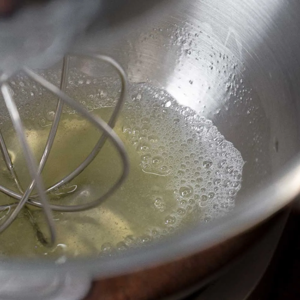 - Как только появились пузырьки, и сироп достиг 110°С, увеличиваем скорость миксера до средне-высокой (4.5 из 6), и взбиваем, пока весь объем белков не превратится в пену.