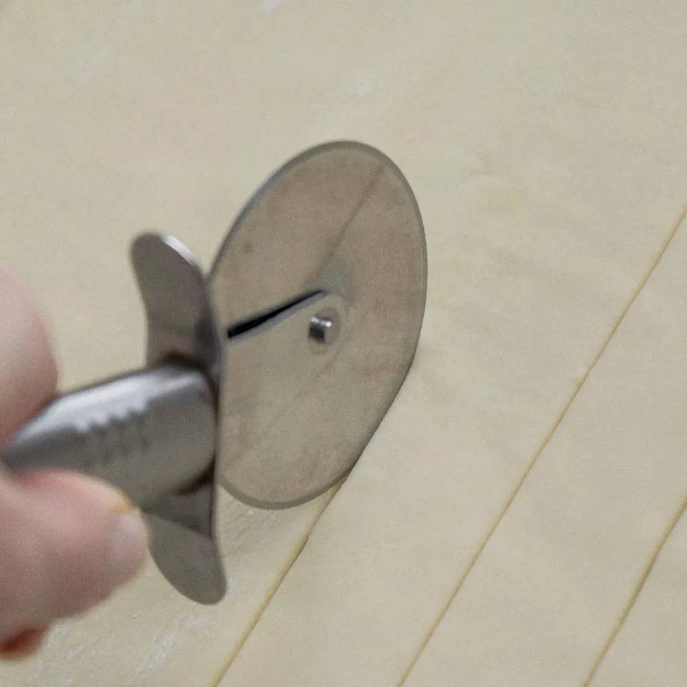 У нас магазинное тесто уже около 3мм толщиной, поэтому я его не раскатываю, а режу сразу. Если у тебя оно толстое — раскатай его хорошенько до 2-3мм.