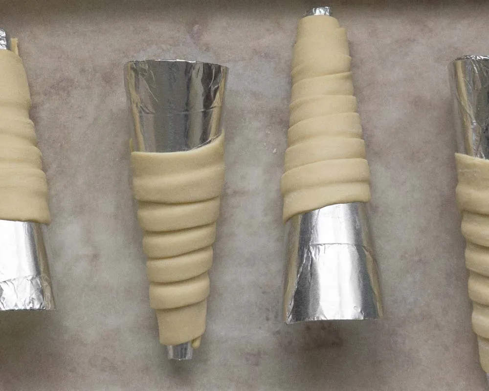 - Наматываем тесто на конусы с нахлестом в ∼5 мм, и выкладываем хвостиком вниз, чтобы он не торчал огромной шапкой после выпечки. Плюс смотри, чтобы тесто не выходило за края широкой стороны конуса, иначе ее придется оттуда выколупывать, и ломать заготовку.
