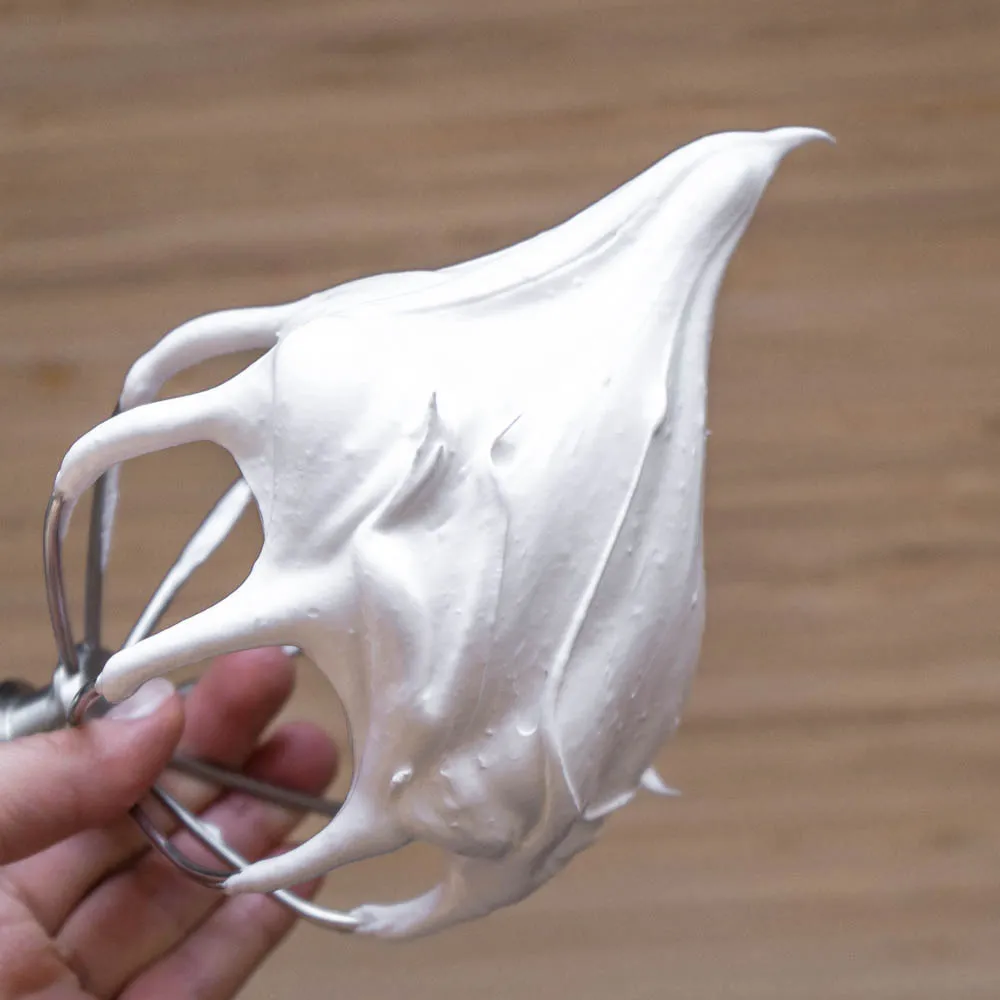 Льем по стенке чаши, стараясь не попадать на венчик, чтобы он не растянул сироп в сахарные нити. Взбиваем, пока меренга не остынет до 30-35°С. Меренга должна получиться плотная, но мягкая, с уверенным птичьим клювом.